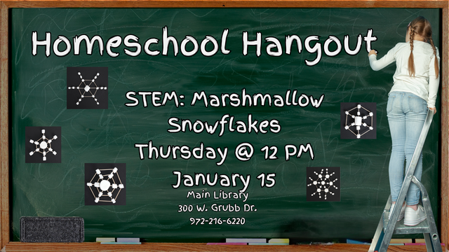 Looking for a place to meet up, hang out and participate in a lesson lead project. Learn to make marshmallow snowflakes and the science behind snowflakes.